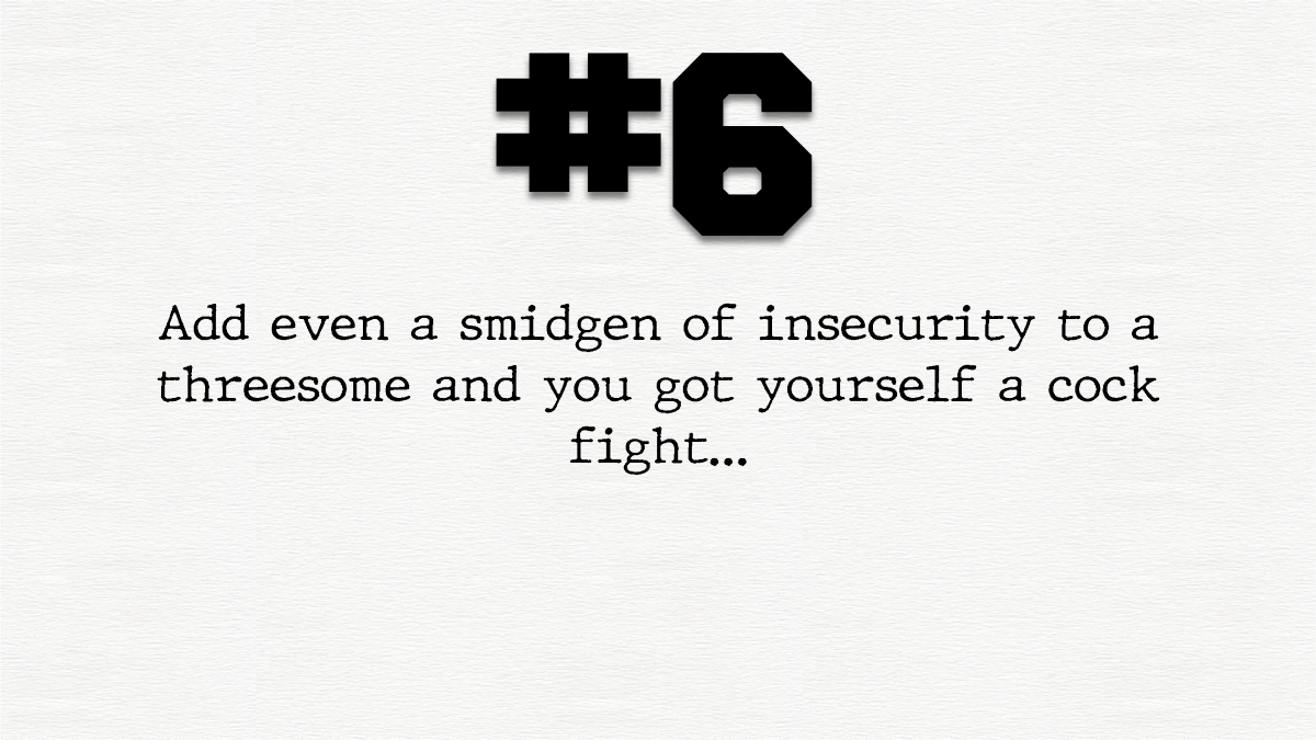 And while the idea of a threesome might seem like a good one in movies and fantasies, the reality of it is that, at any given moment, one person will get less attention than the other two. That’s just a mathematical certainty. Add even a smidgen of insecurity to a threesome and you got yourself a cock fight.