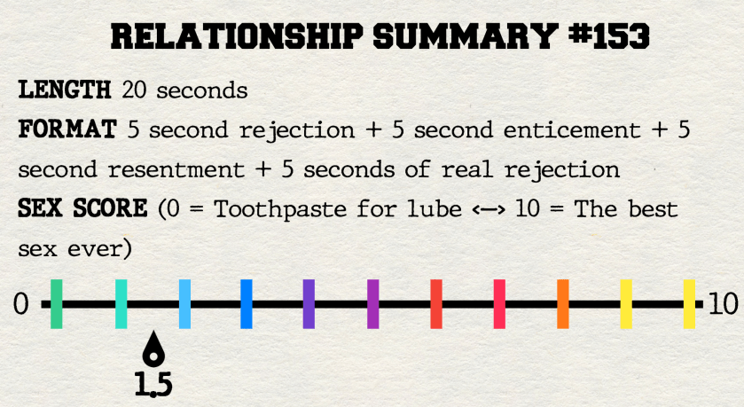 Feeling regret over the fact I had committed pity sex because I once again mistook my ego for the universe I found myself in a steam room later that night, where Guy #153 came out of nowhere and pushed his penis into my mouth. I angrily pushed him away and turned my head down, a rejection as obvious as they come.