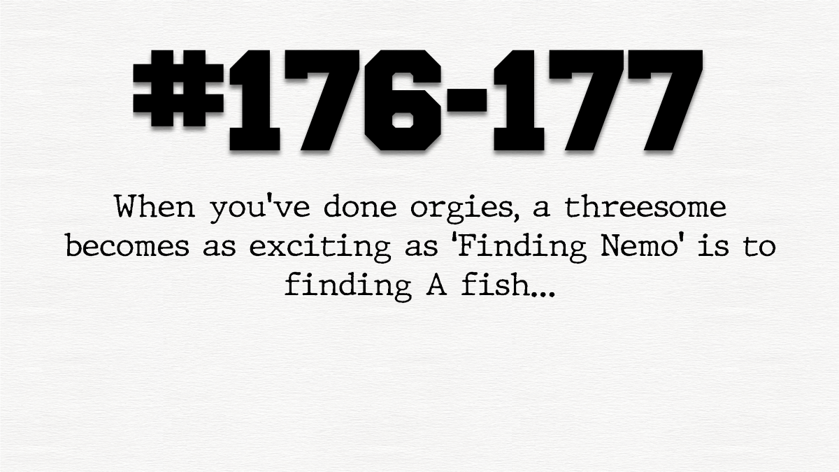 Guy #177 and I chatted for a while, discussed sexual preferences and even pondered setting a date with the three of us, which then never materialized because we lived too far apart for me to be truly bothered. Threesomes top twosomes, but when you’ve done orgies, a threesome is about as exciting as Finding Nemo is to Finding A Fish.